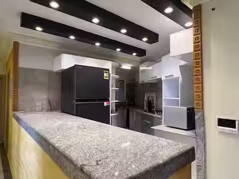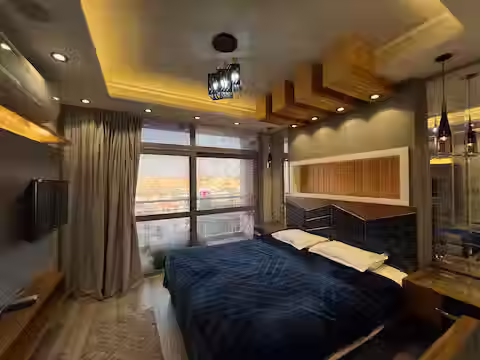 This stylish, wood-themed 3-bedroom apt in One Kattameya offers a luxurious stay experience. Master bedroom includes a king bed and dressing area. The second bedroom also features a king-sized bed, wardrobe, and desk, while the third bedroom has two single beds with a wardrobe and dressing table. The spacious living area includes a dining table, reception set, and TV. The kitchen is fully equipped with all appliances. Conveniently located near Starbucks, Pizza Hut, KFC and Mcdonalds.
